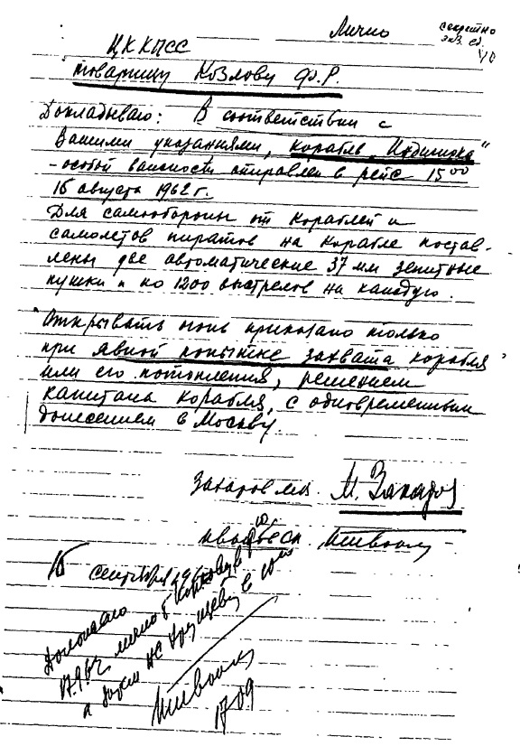 (Handwritten on the document by S. Ivanov: Reported 17.9.62 personally to Comrade Kozlov at 9.10, and then to N. S, Khrushchev at 10.00)