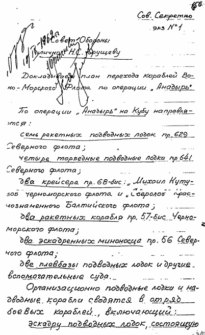 18 September 1962 / Report from Zakharov and Fokin to Khrushchev on Soviet Navy’s plans to support Operation Anadyr