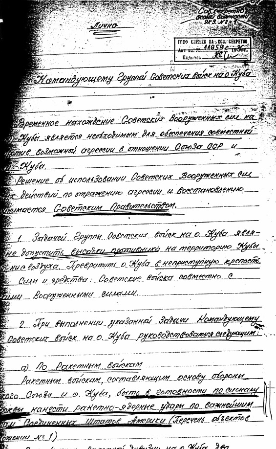 6. The operations plan for the use of the Group of Soviet Forces in Cuba is to be drawn up by 01 November 1962. [Translator Note: Date filled in by a different hand]