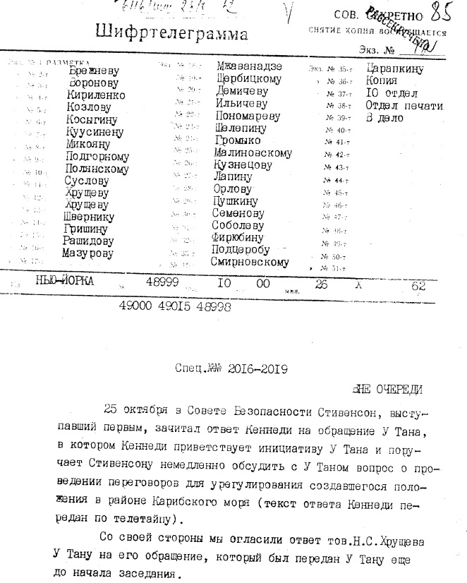On 25 October at the Security Council, Stevenson, who appeared first, read aloud Kennedy’s response to U Thant’s address, in which Kennedy welcomed U Thant’s initiative and authorized Stevenson to discuss with U Thant the issue of conducting talks to settle the situation in the Caribbean Sea (a copy of Kennedy’s response was sent via teletype).