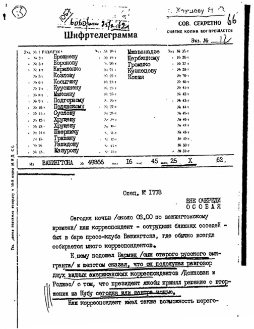 [Translator’s note: Distribution for this cable is as follows: Brezhnev, Voronov, Kirilenko, Kozlov, Kuusinen, Mikoyan, Podgornyy, Polyanskiy, Suslov, Khrushchev, Khrushchev, Shvernik, Grishin, Rashidov, Mazurov, Mzhavanadze, Shcherbitskiy, Ponomarev, Gromyko, Kuznetsov]