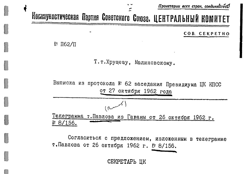 27 October 1962 / Directive from the Presidium of the CPSU Central Committee in response to PAVLOV’s enciphered cable