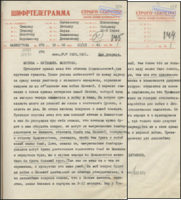 On 8 December 1941, new Soviet Ambassador to the United States Maksim Maksimovich Litvinov met with US President Franklin Roosevelt to present same with his credentials and address the Japanese attack on Pearl Harbor. The following is an English translation of the coded telegram penned by Litvinov that day (sent to Moscow on 10 December). The header information notes that copies of this telegram were sent to Stalin, Molotov, Voroshilov, Kaganovich, Mikoyan, Beria, Vyshinskiy, Dekanozov, Lozovskiy, Sobolev, and the 10th Department.