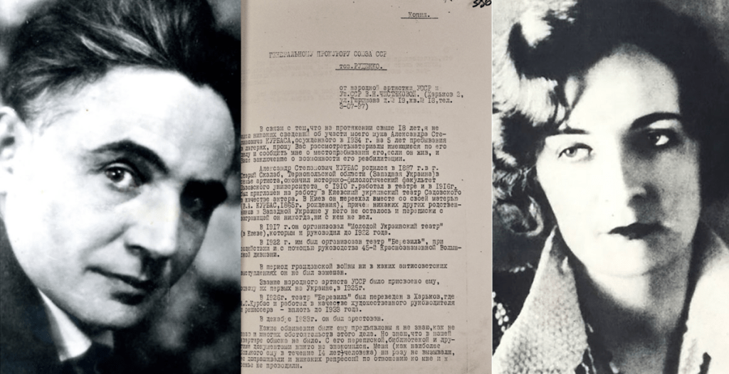 The following is a copy of an undated letter to the Prosecutor General of the USSR Rudenko from People’s Artist of the Ukrainian SSR and UZ SSR Valentina Chistyakova with a request to provide information about her husband Oleksandr Kurbas, who was sentenced in 1934 to 5 years of imprisonment, information about his whereabouts, and the possibility of providing an opinion on rehabilitation. What Chistyakova did not know when writing the letter is that Kurbas was shot on 3 November 1937 with 289 other members of the Ukrainian intelligentsia at the killing field and burial ground of Sandarmokh near Medvezhyegorsk, in Karelia (northwest Russia), a site discovered in 1997 by members of the Memorial Society. This letter first appeared in 2020 on the website of the Digital Archive of the Ukrainian Liberation Movement.