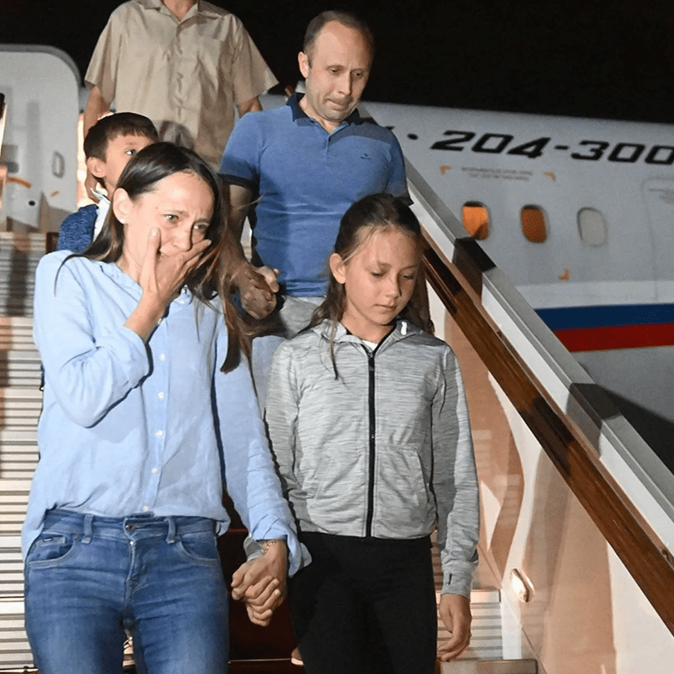 In July 2024, a court in Ljubljana sentenced Artem and Anna Dultsev to 1 year and 7 months in prison on charges of espionage. The Dultsev children, Sofia and Daniil, were also part of the August 1 exchange. As the family walked down the gangway at Vnukovo, Putin addressed the children in Spanish, telling them, “Buenas noches!”