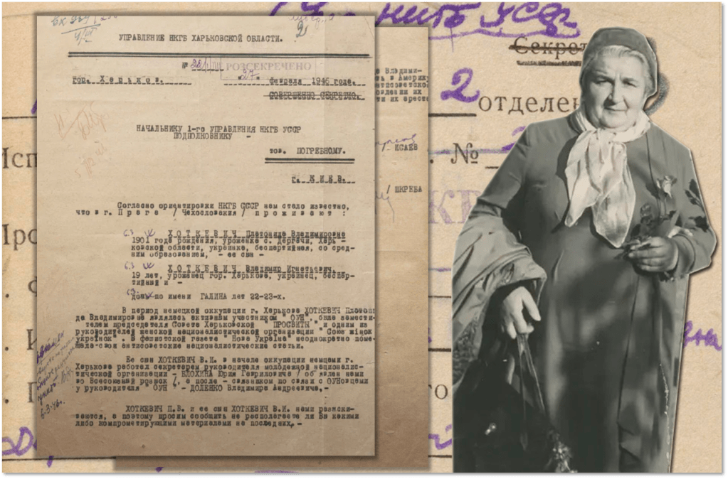 The NKVD opened a case against Platonida Khotkevych in 1946, when it became clear that she had previously been living in Nazi-occupied territory. Officially, they wanted to arrest Platonida for allegedly declaring her intention to go to America to publish an anti-Soviet book.