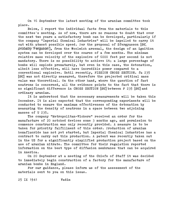 In September 1941, a Soviet rezident in London known as ‘Vadim’ (now known to be Anatoly Gorsky) sent an enciphered Top Secret cable to his NKVD colleagues in Moscow regarding details of a recent meeting of the “uranium committee” (presumed to be a reference to the MAUD Committee) and England’s continued efforts at pursuing the development of a nuclear bomb.