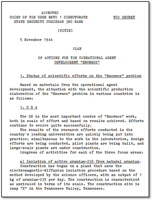 On 5 November 1944, the head of the Soviet NKVD Foreign Intelligence Directorate, Pavel Mikhaylovich Fitin, disseminated a Top Secret report on global advances in the field of nuclear weapon developments. The list of addressees for the report is not included in the material, but given the level of detail and the highly sensitive nature of the information, it could only have been meant for the upper echelons of Soviet leadership.