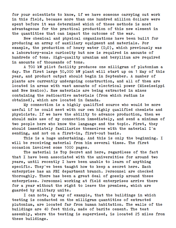 Today we look at a March 1944 letter from the US-based GRU spy Arthur Adams, whose covername was “Akhill” (Achilles), to the Director of the GRU on American progress in efforts to create a nuclear weapon.