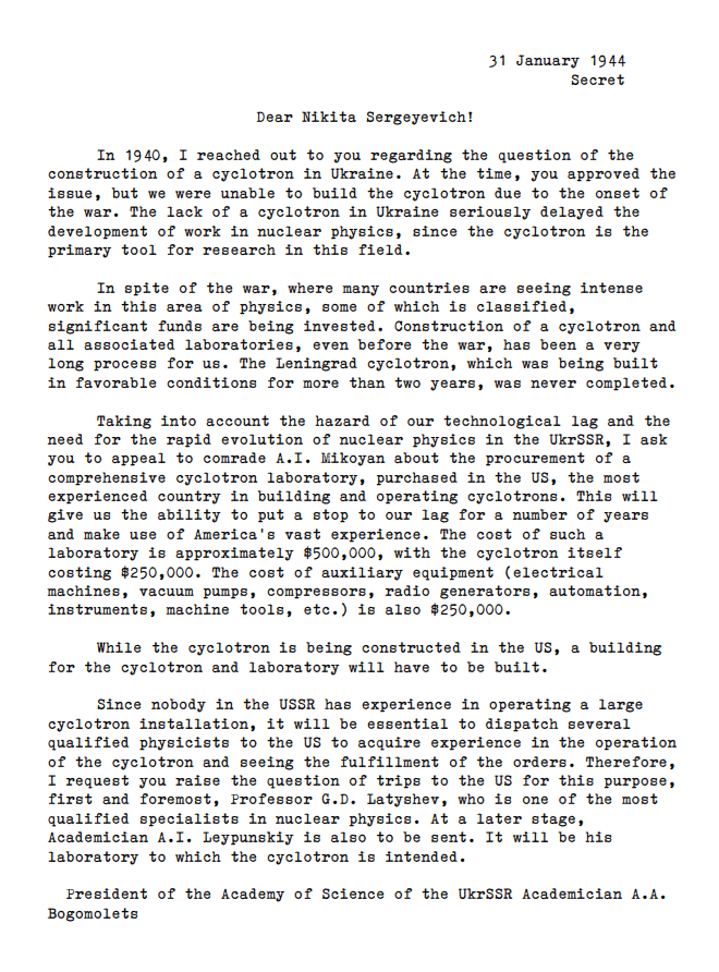 In early 1944, the President of the Ukrainian SSR Academy of Science Akademik A.A. Bogomolets sent a Secret letter to then-Chair of the Council of the People’s Commissars of the Ukrainian SSR Nikita Khrushchev, asking him to look into the possibility of not only procuring a cyclotron laboratory to hasten the Soviet Union’s lagging exploration and exploitation of nuclear physics, but to have the laboratory and its equipment built in the United States. The plan would call for a select group of Soviet physicists to be sent to the US in two phases to become acquainted with the technology.