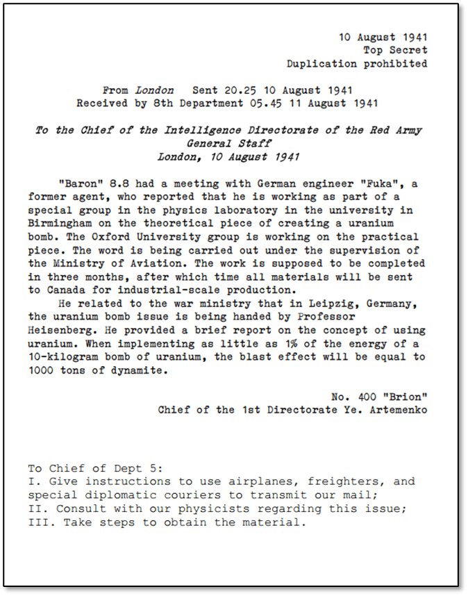 The following is a decrypted Top Secret message from the head of the London rezidentura to the Intelligence Directorate of the Red Army General Staff on work in England to create an atomic bomb. The message provides information provided by Agent “Baron” (Simon Davidovich Kremer) regarding his meeting with German physicist-turned-spy Klaus Fuchs (covername “Fuka”) on the state of England’s efforts in building an atomic bomb. As a side note, Fuchs was also given the covername “Otto” by other assets.