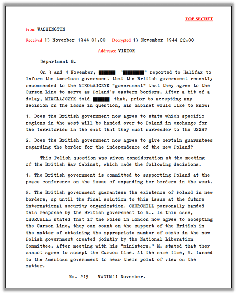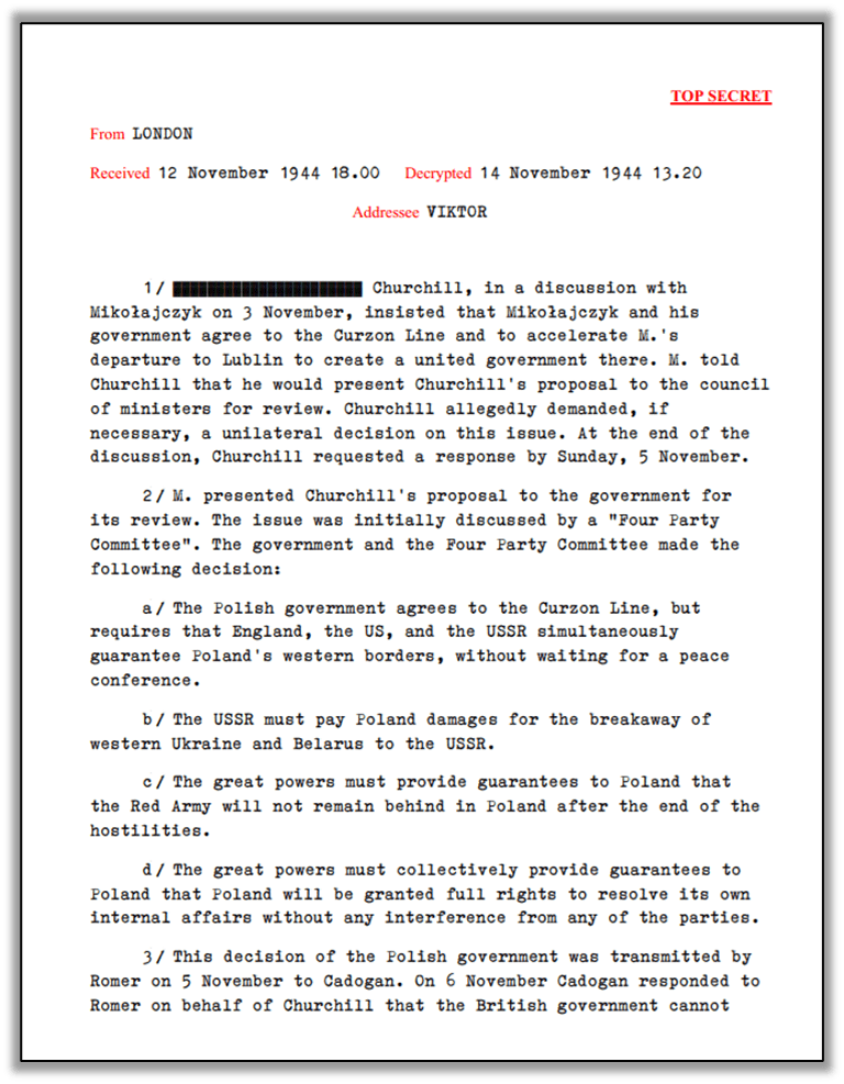 Under these conditions, the Soviet leadership was increasingly inclined to cooperate exclusively with the PCNL. This was largely facilitated by the information coming from the Five about the attitude of the Western Allies themselves, who were also beginning to tire of the Poles’ attitude, toward Mikołajczyk and his “ministers.” Thus, in November 1944, intelligence reported to Moscow about the growing tension between the British and the Polish émigrés: Churchill, irritated by Polish willfulness, put pressure on Mikołajczyk, forcing him to accept the Curzon Line and pushing him toward dialogue with the PCNL.