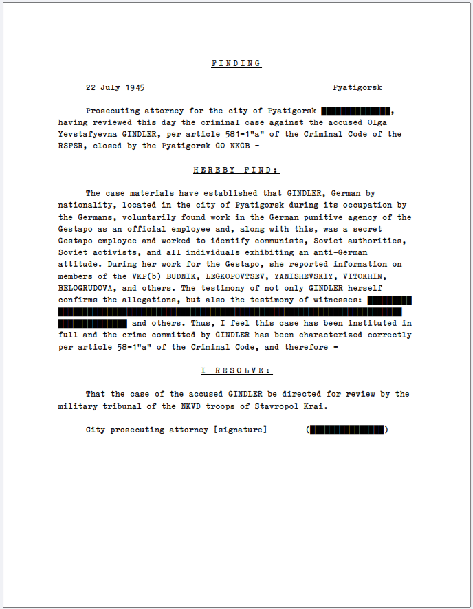 The investigation established that Gindler did not hide her work for the Gestapo; on the contrary, she was proud of her involvement in the activities and (according to the Stavropol Krai FSB) threatened to have killed those she disliked. Later, she was recruited as an agent under the covername “Vorobey” [Воробей – Sparrow] with the task of identifying communists, Soviet authorities, and police officers in hiding, as well as individuals with anti-German sentiments.