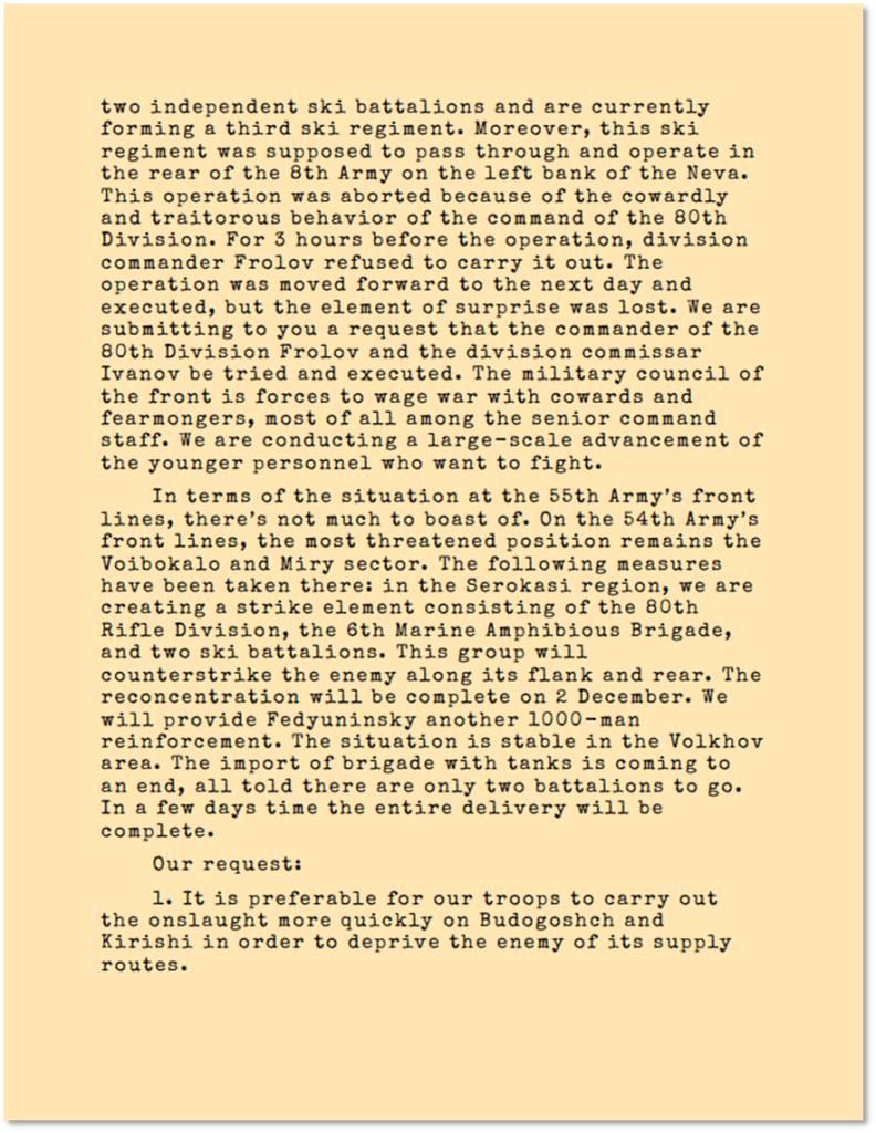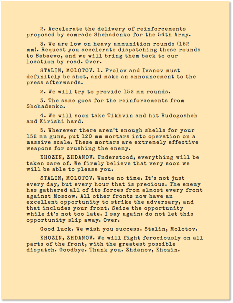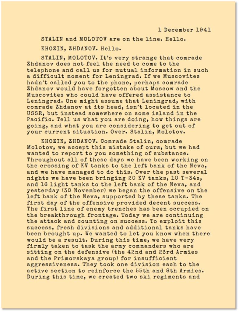 The following pages show a different story conveyed by Zhdanov and Khozin in a transcribed telegraph conversation with Stalin and Molotov on 1 December 1941. But before the report even begins, it is worth noting that Zhdanov received quite the lengthy reproach from Moscow on his inability to provide information on how things were going.
