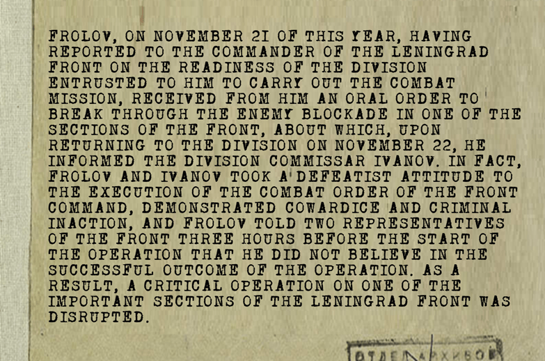 The order from Moscow was carried out as prescribed. On December 2, 1941, the military tribunal of the Leningrad Front sentenced the former commander of the 80th Rifle Division, Colonel I.M. Frolov, and the former commissar of the same division, K.D. Ivanov, to death. Excerpt from the verdict: