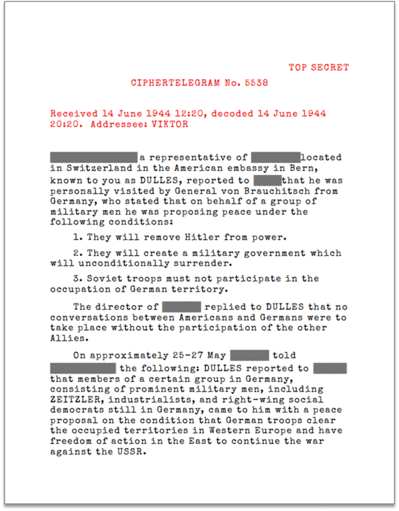 On 14 June 1944, an unidentified Soviet human intelligence agent in Washington intercepted information that Allen Dulles, at the time the Swiss Director of the Office of Strategic Services, had been approached by German General Walther von Brauchitsch in Switzerland to meet at the US Embassy in Bern to discuss a peace proposal. The German, still licking his wounds after having been dismissed as Commander-in-Chief of the German Army the previous December for the failed offensive in Russia, was interested in meeting with the Allies – with the exception of the Soviets – to lay out the details of the proposal. The details were captured in a ciphertelegram dispatched to the 5th Department of the People’s Commissariat for State Security, to the codenamed addressee “VIKTOR”.