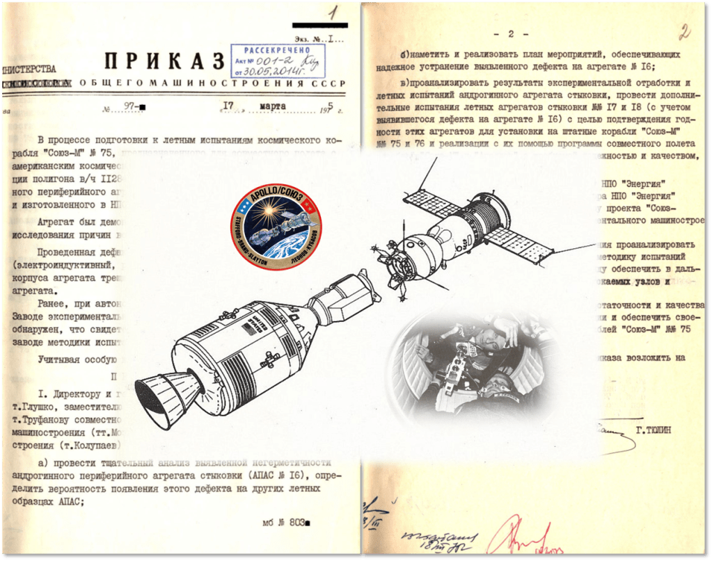 But four short months before that historic event, according to a declassified Top Secret document from the Soviet Ministry of General Machine Building, a leak was detected in the Androgynous Peripheral Attach System (APAS), the docking system to be used to connect the US and Soviet spacecraft together. Because of the international visibility of the program, the General Machine Building Deputy Minister Georgiy Tyulin issued a 17 March 1975 Top Secret order demanding all hands come together to figure out the cause of the defect, whether or not the same flaw could manifest in the other models, come up with a plan of action to eliminate said flaw, and study the results of the APAS flight testing, as well as the testing of other units in the series. Other tasks included a breakdown of the current pressure-testing methodology used at NPO Energiya [NPO – scientific development and production center], the production plant responsible for the APAS components.