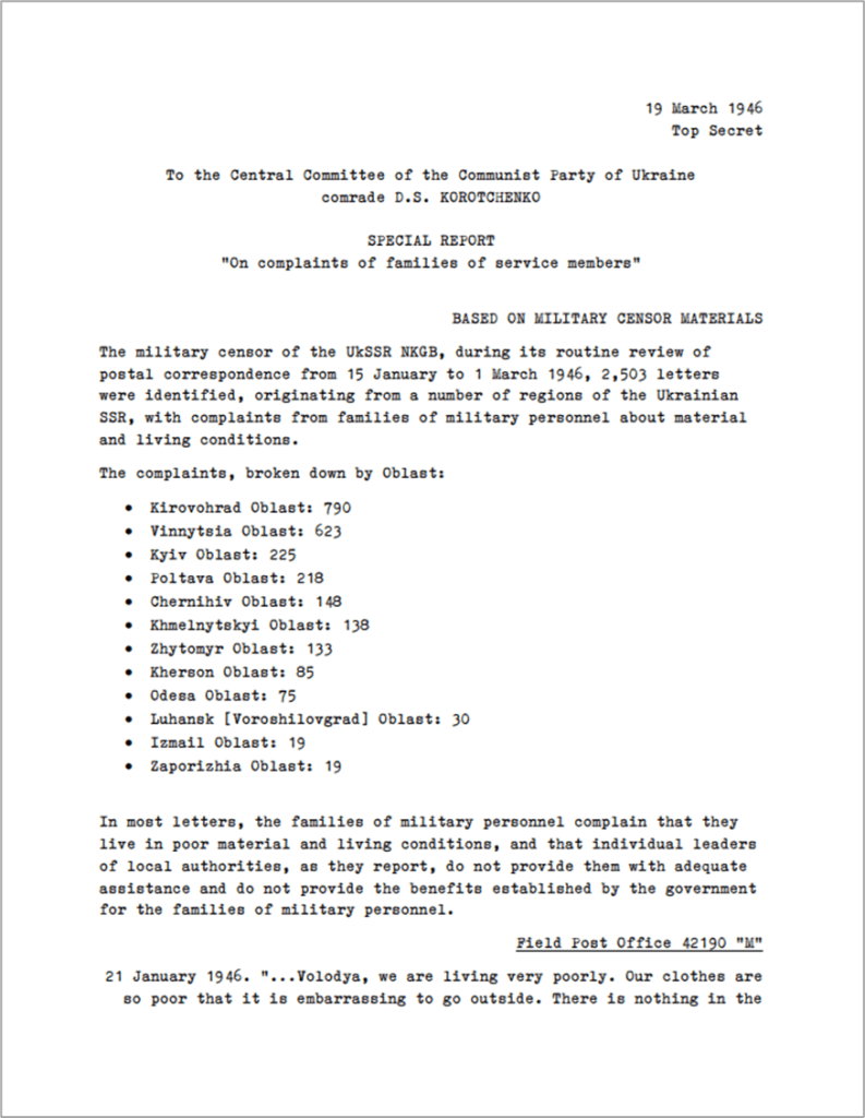At the end of the report, Yesipenko instructs that the regional Communist Party committees in the highlighted Ukrainian regions were informed of the censors’ findings. This statement can be taken at face value, but who would have to answer for the damning information contained in the letters is a complex question, the answer to which is left up to the imagination of the today’s audience.
