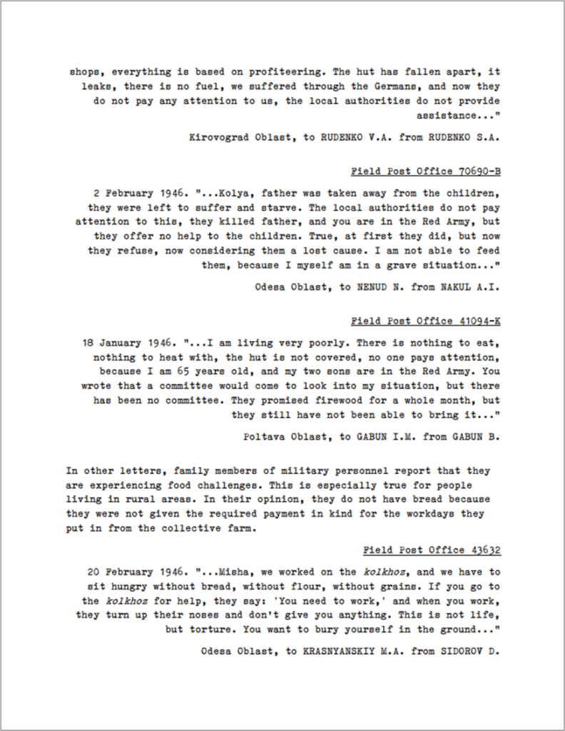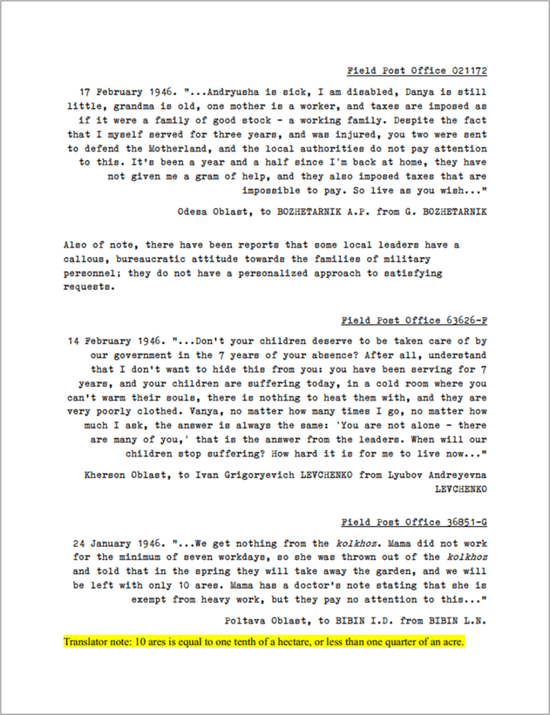 The report covers complaints from family members of Ukrainian servicemen. While the men were presumably off tending to post-war cleanup and peacekeeping activities, the families identified in the report wrote to them, bemoaning their pitiful situations: squalor, starvation, or facing unfair taxation with no way to satisfy the tax collectors. The picture presented to the modern-day reader looks bleak across the board.