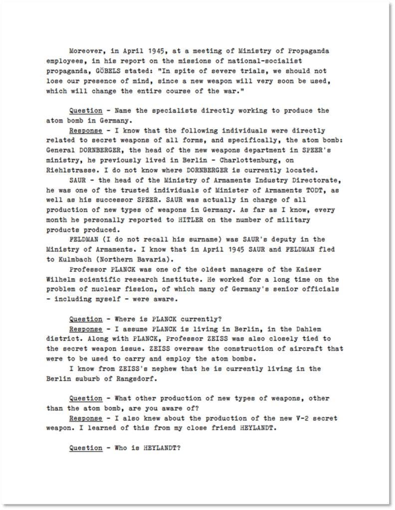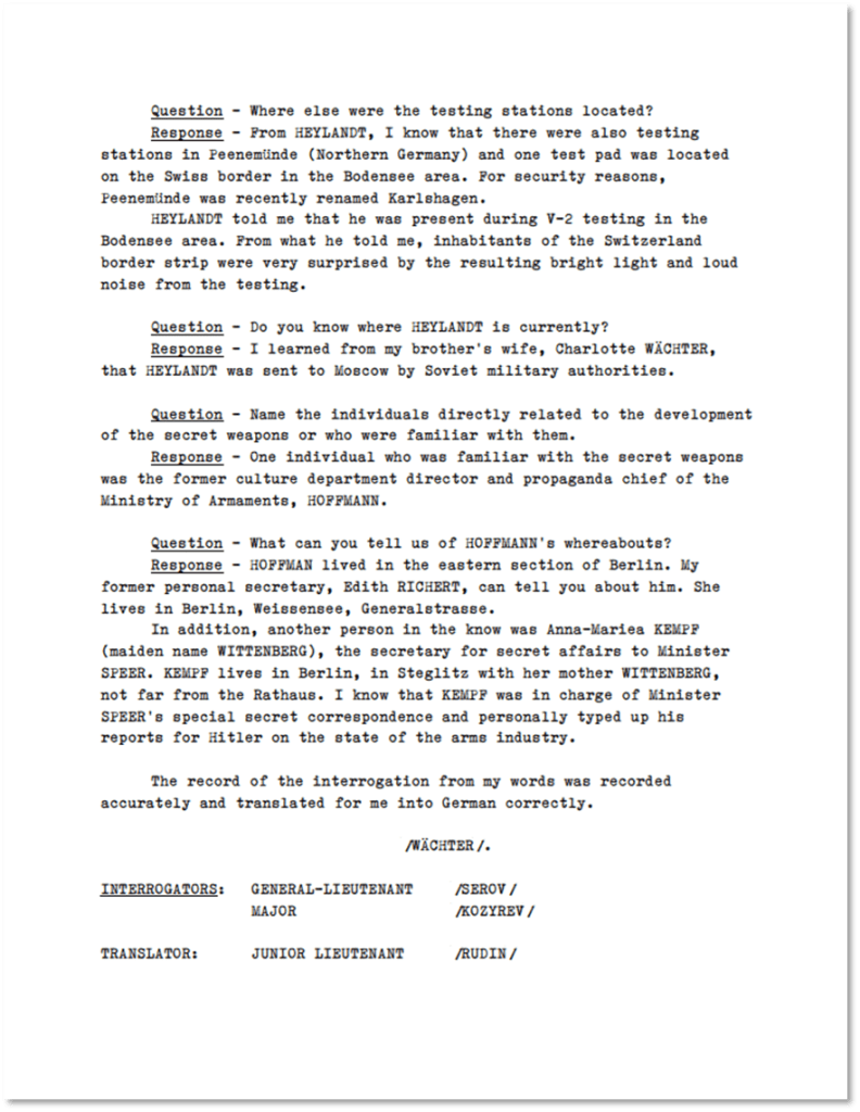 During the investigation, Wächter testified about the development of new types of weapons by Nazi Germany and, in particular, about the German atomic bomb, as well as other classified weapon developments and the people who knew about them.
