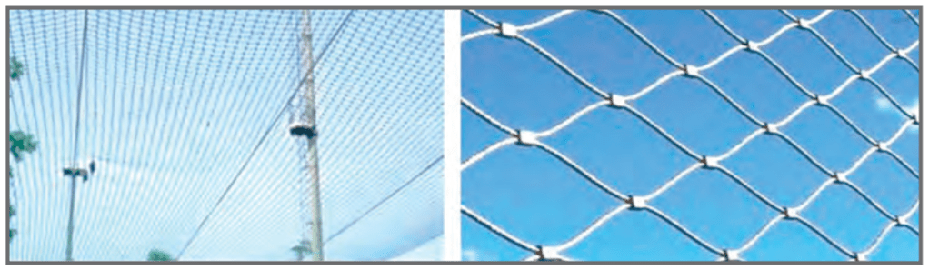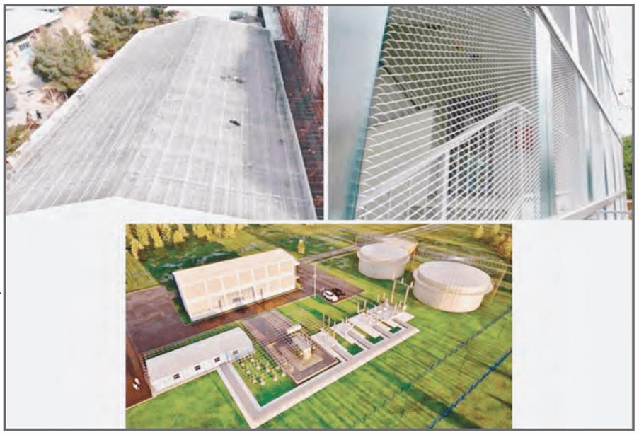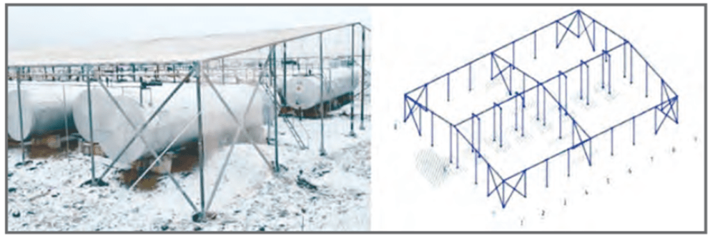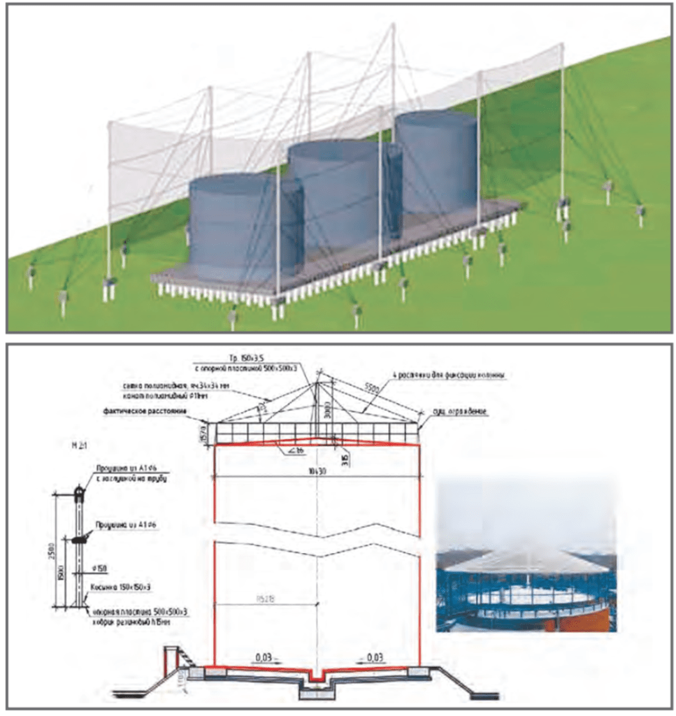 Protection of fixed upright tanks is provided by installing canopies with the space between the supporting elements filled with nylon netting (or chain-link mesh) with mesh grids no larger than 35×35 mm (Figure 4). The simplicity of the canopy design allows them to be created from previously used materials (decommissioned pipelines, etc.).