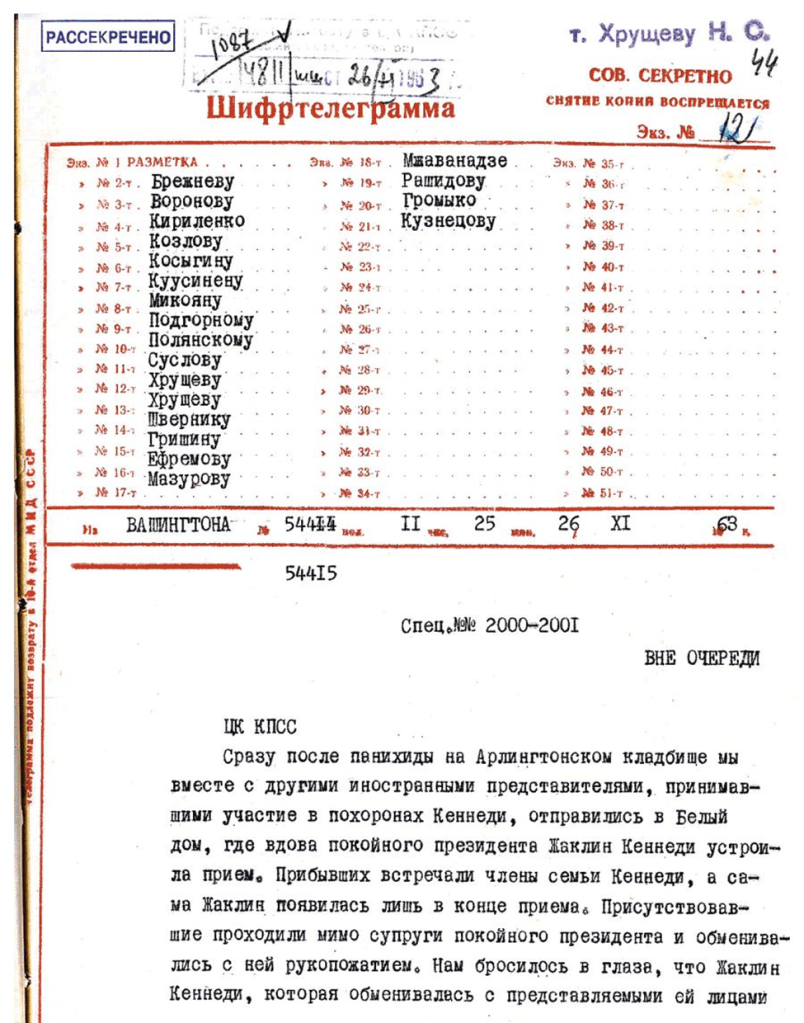 In conclusion, Jacqueline Kennedy expressed her heartfelt gratitude to N.S. Khrushchev and to us for our warm support and for the fact that we had specially traveled to the USA to attend her husband’s funeral.