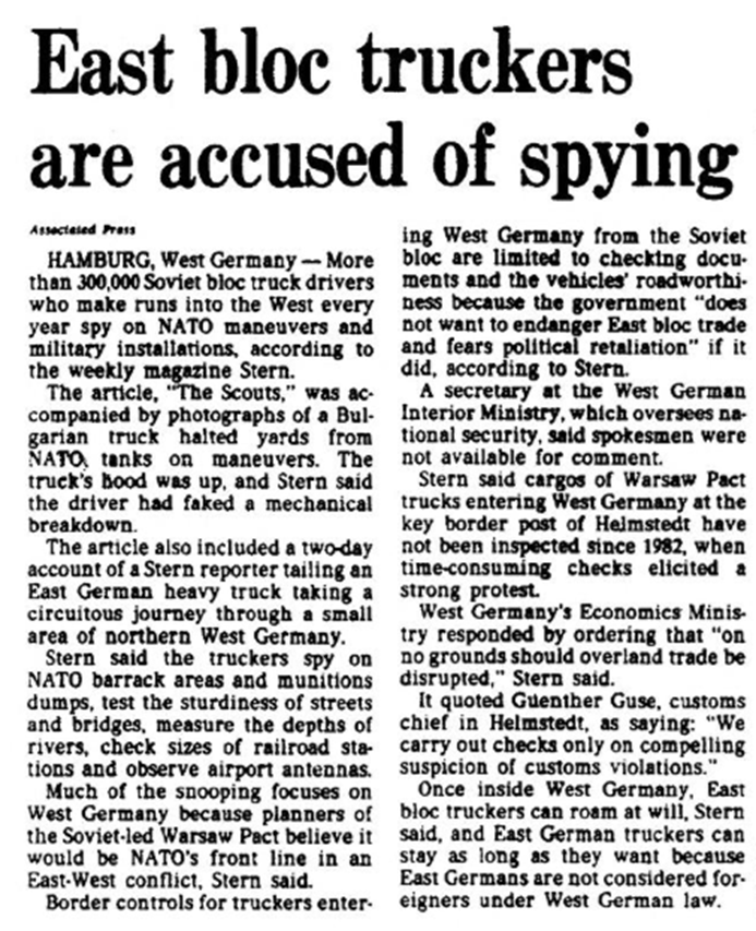 I was able to track down the article referred to above in the 9 January 1986 copy of Stern. The six-page article provides a bit of a chilling look at priorities at the time, with cooler heads recognizing that stopping every truck coming through the country can’t be stopped, even with compelling evidence of ‘visual espionage’ being carried out, as the political and economic consequences could be quite jarring for all sides. Regardless, it’s a fascinating glimpse back into the days of the Reagan-Gorbachev Cold War, when things like troop movements and weapon capabilities/limitations were considered quite sensitive.