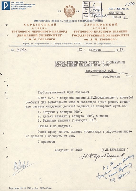 The answer to this riddle can be found in the archives of the RGANTD. The ‘First Space Archive’ contains previously classified correspondence directly related to these images. On August 21, 1967, Academician of the Academy of Sciences of the Ukrainian SSR N.P. Barabashov sent an official letter to the Scientific and Technical Council for Space Research of the USSR Academy of Sciences with a request to report the true dimensions of the parts visible in the panorama. Academician Barabashov referred to these “mysterious details” as “coils” (F. 213. Op. 6-6. D. 148. L. 150).