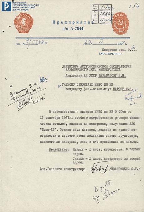 The clarification came back on September 29, 1967 from O.G. Ivanovskiy – Deputy Chief Designer of the Lavochkin Machine-Building Plant, the creator of Luna 13. In his letter to N.P. Barabashov (F. 213. Op. 6-6. D. 148. L. 156), he confirmed that in the first two panoramas the coils are indeed visible, and the third showed a fragment of the soil meter removal mechanism. Attached to the letter was a tracing paper with the exact dimensions of these technical elements of the station (F. 213. Op. 6-6. D. 148. L. 157).
