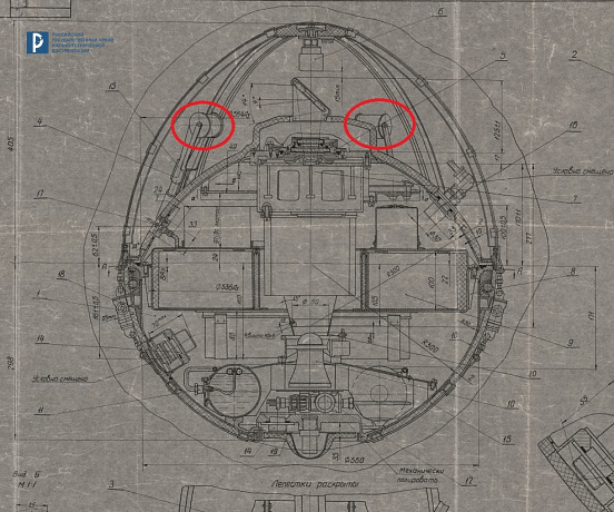 Thus, the “mysterious artifacts” turned out to be standard parts of the spacecraft itself – coils on which the 75-centimeter self-deploying whip antennas were wound. These coils can be seen on a fragment of the drawing of the automatic lunar station (F. 6. Op. 90-2. D. 145), where they are outlined in red ink. The drawing also shows other elements: a hermetic container, an antenna, a porthole, a frame, and various other pieces of equipment.